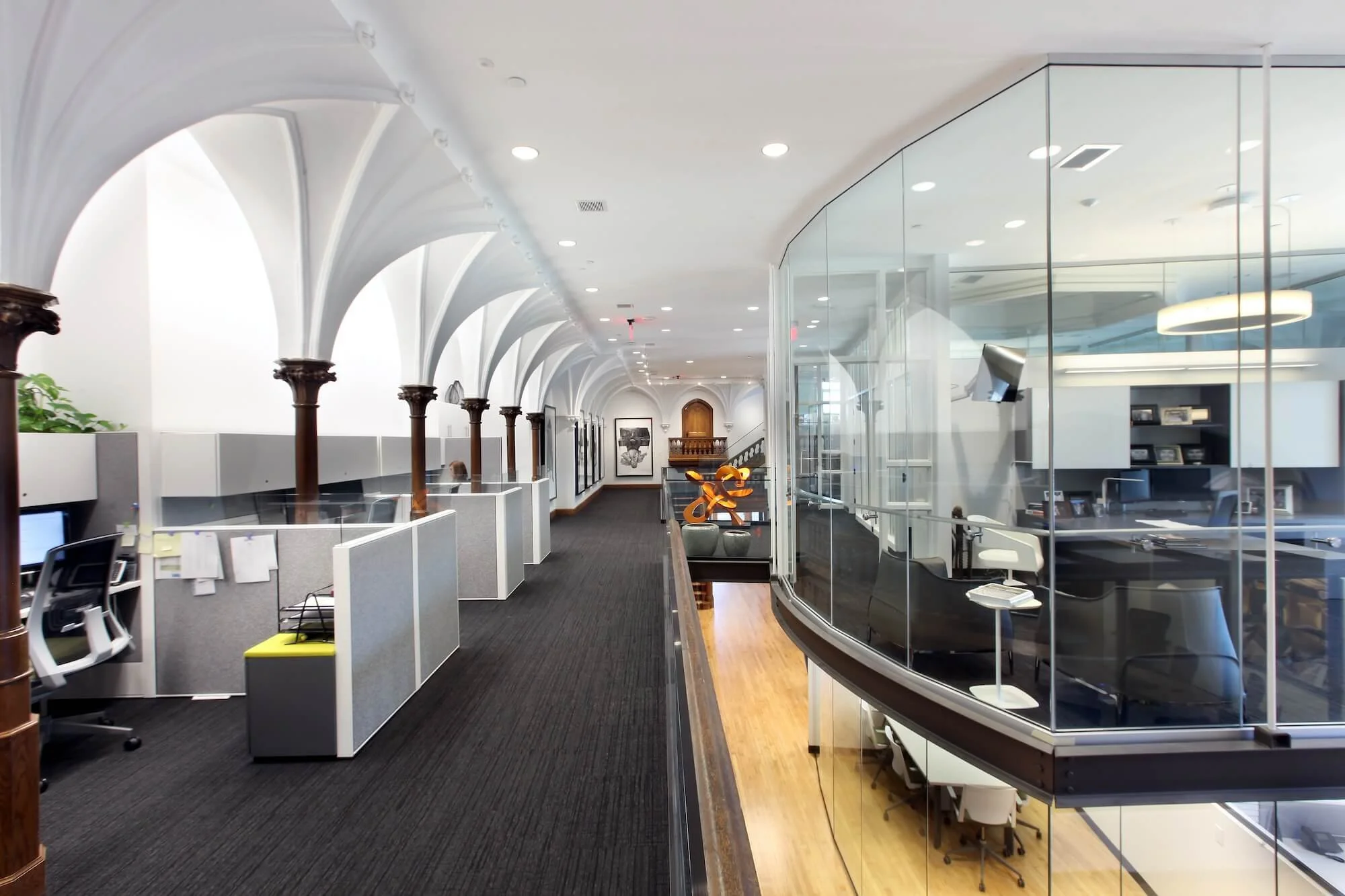 Elegantly designed with glass and wood, the office used the original millwork left by the masons to contrast the glass structure of the central office. Cubicles have been added throughout to add private workspaces. The modern kitchen and coffee bar are finished in light tones to add lightness in contrast to the darker, original wood accents.