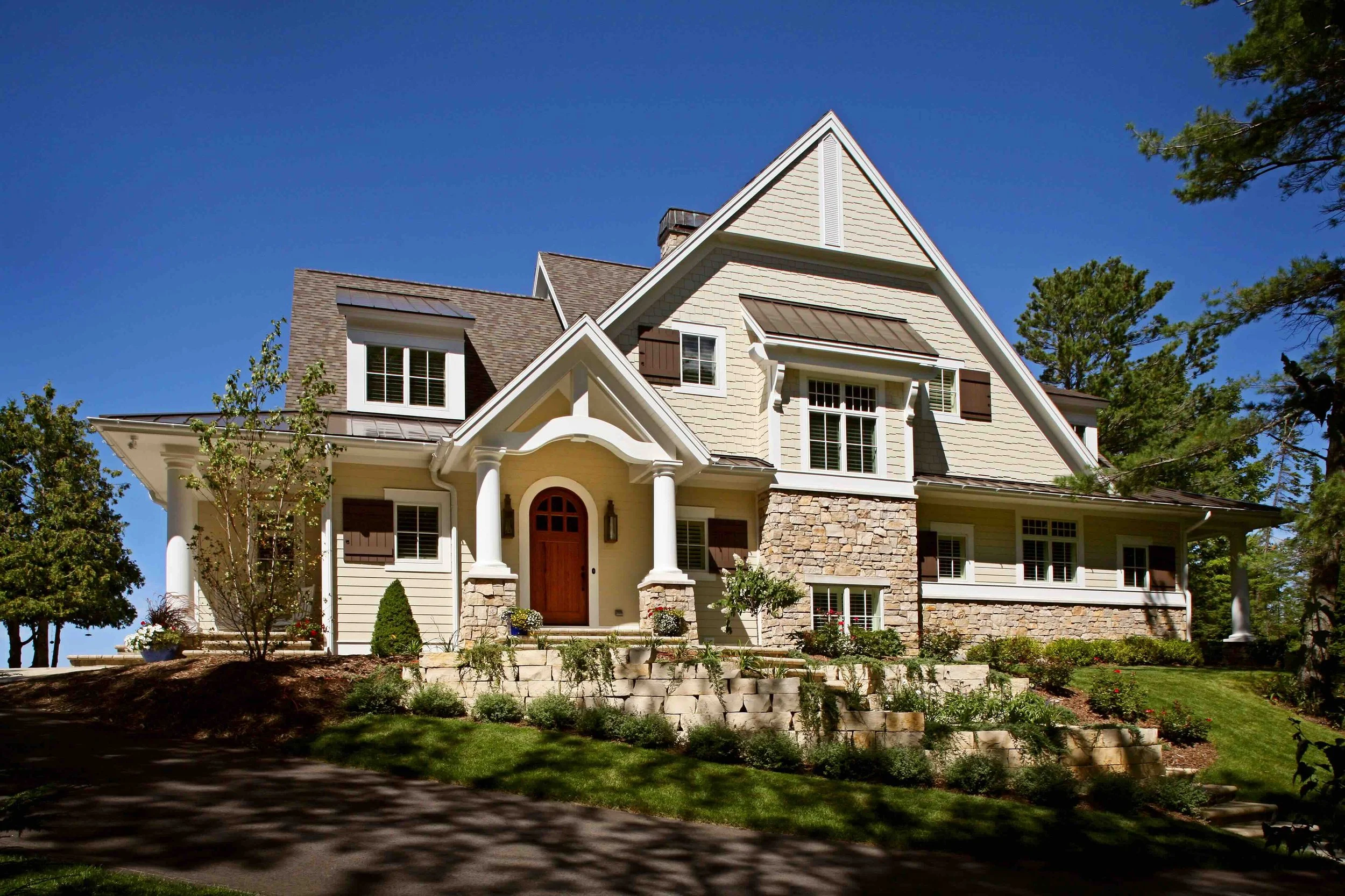 Perched on the shore of Lake Michigan, Kearney Hill replaced an existing cottage close to the homeowners’ hearts. The focal point is a massive, four-sided, wood-burning fireplace reminiscent of the original cottage hearth. Instead of locating this fireplace along one of the outer walls, Wayne Visbeen suggested positioning it at the center of the living space. This allowed lake views to remain unimpeded while providing a beautiful foundation for the layout. This substantial chimney extends upward through the home’s central gable peak, the heart of the house.